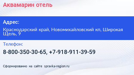 Аквамарин, отель по адресу Краснодарский край, Новомихайловский кп, Широкая Щель, 9 в дальнейшем Организация, размещена в следующих категориях: