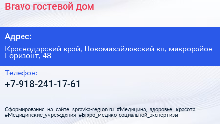 Bravo, гостевой дом по адресу Краснодарский край, Новомихайловский кп, микрорайон Горизонт, 48 в дальнейшем Организация, размещена в следующих категориях: