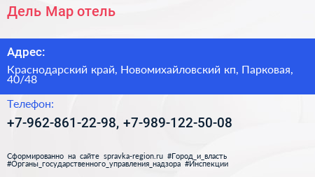 Дель Мар, отель по адресу Краснодарский край, Новомихайловский кп, Парковая, 40/48 в дальнейшем Организация, размещена в следующих категориях:
