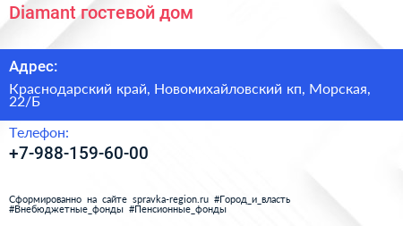 Diamant, гостевой дом по адресу Краснодарский край, Новомихайловский кп, Морская, 22/Б в дальнейшем Организация, размещена в следующих категориях: