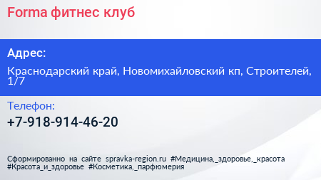 Forma, фитнес-клуб по адресу Краснодарский край, Новомихайловский кп, Строителей, 1/7 в дальнейшем Организация, размещена в следующих категориях: