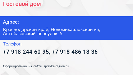 Гостевой дом по адресу Краснодарский край, Новомихайловский кп, Автобазовский переулок, 5 в дальнейшем Организация, размещена в следующих категориях: