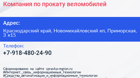 Компания по прокату веломобилей по адресу Краснодарский край, Новомихайловский кп, Приморская, 3 к15 в дальнейшем Организация, размещена в следующих категориях: