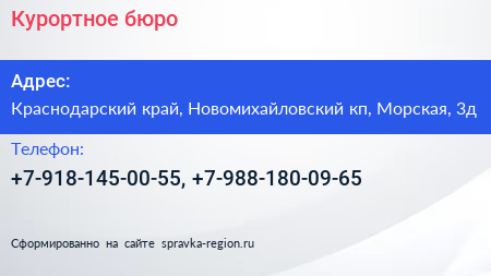 Курортное бюро по адресу Краснодарский край, Новомихайловский кп, Морская, 3д в дальнейшем Организация, размещена в следующих категориях: