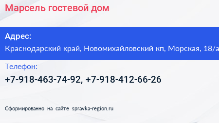 Марсель, гостевой дом по адресу Краснодарский край, Новомихайловский кп, Морская, 18/а в дальнейшем Организация, размещена в следующих категориях: