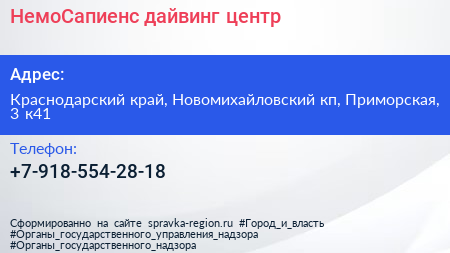 НемоСапиенс, дайвинг-центр по адресу Краснодарский край, Новомихайловский кп, Приморская, 3 к41 в дальнейшем Организация, размещена в следующих категориях: