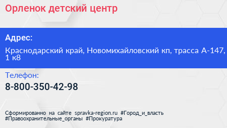 Орленок, детский центр по адресу Краснодарский край, Новомихайловский кп, трасса А-147, 1 к8 в дальнейшем Организация, размещена в следующих категориях: