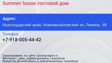 Summer house, гостевой дом по адресу Краснодарский край, Новомихайловский кп, Ленина, 48 в дальнейшем Организация, размещена в следующих категориях: