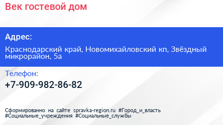 Век, гостевой дом по адресу Краснодарский край, Новомихайловский кп, Звёздный микрорайон, 5а в дальнейшем Организация, размещена в следующих категориях: