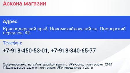 Аскона, магазин по адресу Краснодарский край, Новомихайловский кп, Пионерский переулок, 4Б в дальнейшем Организация, размещена в следующих категориях: