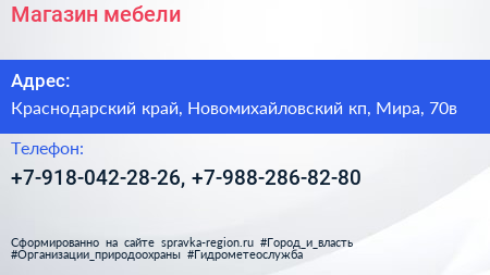 Магазин мебели по адресу Краснодарский край, Новомихайловский кп, Мира, 70в в дальнейшем Организация, размещена в следующих категориях: