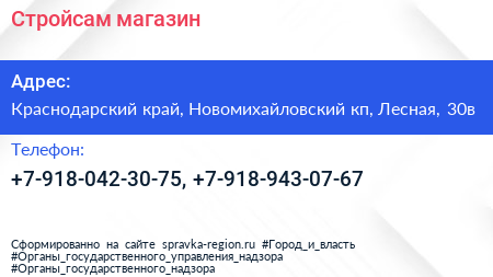 Стройсам, магазин по адресу Краснодарский край, Новомихайловский кп, Лесная, 30в в дальнейшем Организация, размещена в следующих категориях: