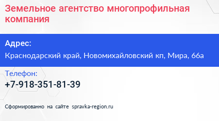 Земельное агентство, многопрофильная компания по адресу Краснодарский край, Новомихайловский кп, Мира, 66а в дальнейшем Организация, размещена в следующих категориях: