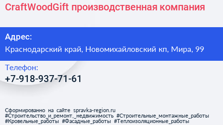 CraftWoodGift, производственная компания по адресу Краснодарский край, Новомихайловский кп, Мира, 99 в дальнейшем Организация, размещена в следующих категориях:
