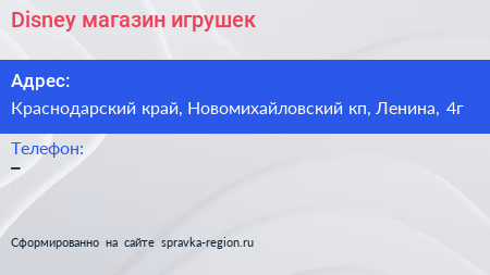Disney, магазин игрушек по адресу Краснодарский край, Новомихайловский кп, Ленина, 4г в дальнейшем Организация, размещена в следующих категориях: