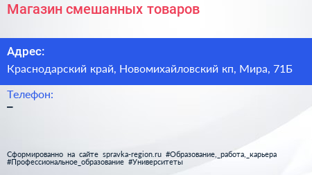 Магазин смешанных товаров по адресу Краснодарский край, Новомихайловский кп, Мира, 71Б в дальнейшем Организация, размещена в следующих категориях: