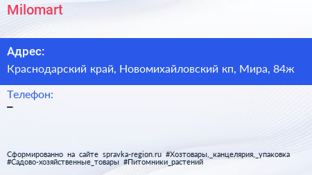 Milomart по адресу Краснодарский край, Новомихайловский кп, Мира, 84ж в дальнейшем Организация, размещена в следующих категориях: