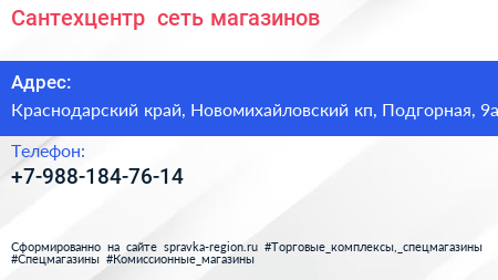 Сантехцентр+, сеть магазинов по адресу Краснодарский край, Новомихайловский кп, Подгорная, 9а в дальнейшем Организация, размещена в следующих категориях: