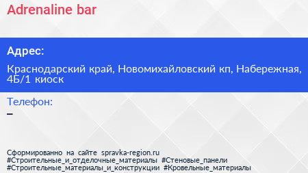 Adrenaline bar по адресу Краснодарский край, Новомихайловский кп, Набережная, 4Б/1 киоск в дальнейшем Организация, размещена в следующих категориях: