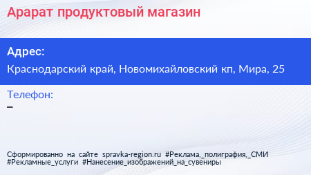 Арарат, продуктовый магазин по адресу Краснодарский край, Новомихайловский кп, Мира, 25 в дальнейшем Организация, размещена в следующих категориях: