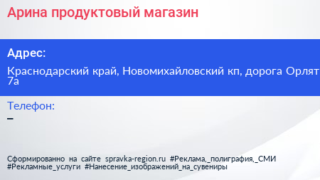 Арина, продуктовый магазин по адресу Краснодарский край, Новомихайловский кп, дорога Орлят, 7а в дальнейшем Организация, размещена в следующих категориях: