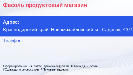 Фасоль, продуктовый магазин по адресу Краснодарский край, Новомихайловский кп, Садовая, 43/1 в дальнейшем Организация, размещена в следующих категориях:
