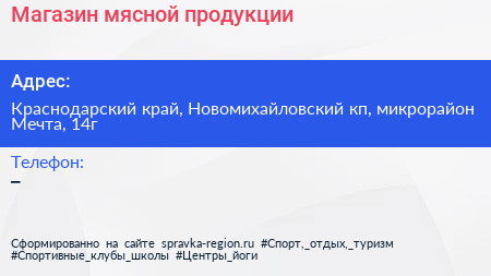 Магазин мясной продукции по адресу Краснодарский край, Новомихайловский кп, микрорайон Мечта, 14г в дальнейшем Организация, размещена в следующих категориях: