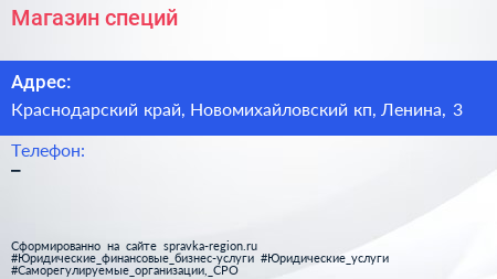 Магазин специй по адресу Краснодарский край, Новомихайловский кп, Ленина, 3 в дальнейшем Организация, размещена в следующих категориях: