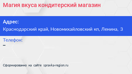 Магия вкуса, кондитерский магазин по адресу Краснодарский край, Новомихайловский кп, Ленина, 3 в дальнейшем Организация, размещена в следующих категориях: