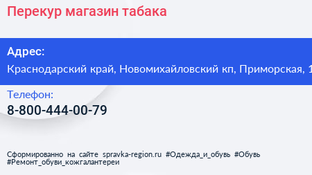 Перекур, магазин табака по адресу Краснодарский край, Новомихайловский кп, Приморская, 1 в дальнейшем Организация, размещена в следующих категориях: