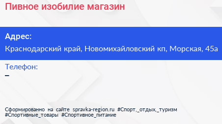 Пивное изобилие, магазин по адресу Краснодарский край, Новомихайловский кп, Морская, 45а в дальнейшем Организация, размещена в следующих категориях: