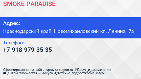 SMOKE PARADISE по адресу Краснодарский край, Новомихайловский кп, Ленина, 7а в дальнейшем Организация, размещена в следующих категориях: