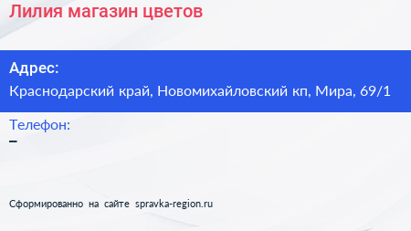 Лилия, магазин цветов по адресу Краснодарский край, Новомихайловский кп, Мира, 69/1 в дальнейшем Организация, размещена в следующих категориях: