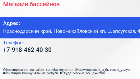 Магазин бассейнов по адресу Краснодарский край, Новомихайловский кп, Шапсугская, 4 в дальнейшем Организация, размещена в следующих категориях: