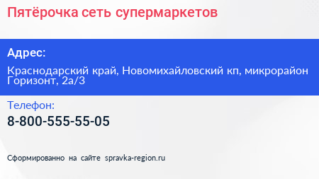 Пятёрочка, сеть супермаркетов по адресу Краснодарский край, Новомихайловский кп, микрорайон Горизонт, 2а/3 в дальнейшем Организация, размещена в следующих категориях: