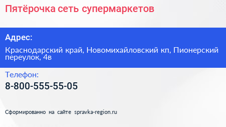 Пятёрочка, сеть супермаркетов по адресу Краснодарский край, Новомихайловский кп, Пионерский переулок, 4в в дальнейшем Организация, размещена в следующих категориях: