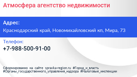Атмосфера, агентство недвижимости по адресу Краснодарский край, Новомихайловский кп, Мира, 73 в дальнейшем Организация, размещена в следующих категориях: