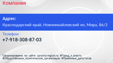Компания по адресу Краснодарский край, Новомихайловский кп, Мира, 86/2 в дальнейшем Организация, размещена в следующих категориях: