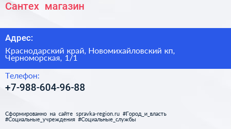 Сантех+, магазин по адресу Краснодарский край, Новомихайловский кп, Черноморская, 1/1 в дальнейшем Организация, размещена в следующих категориях: