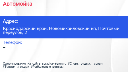 Автомойка по адресу Краснодарский край, Новомихайловский кп, Почтовый переулок, 2 в дальнейшем Организация, размещена в следующих категориях: