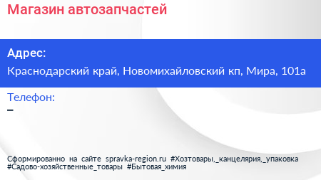 Магазин автозапчастей по адресу Краснодарский край, Новомихайловский кп, Мира, 101а в дальнейшем Организация, размещена в следующих категориях: