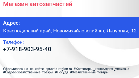 Магазин автозапчастей по адресу Краснодарский край, Новомихайловский кп, Лазурная, 12 в дальнейшем Организация, размещена в следующих категориях: