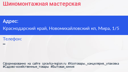 Шиномонтажная мастерская по адресу Краснодарский край, Новомихайловский кп, Мира, 1/5 в дальнейшем Организация, размещена в следующих категориях: