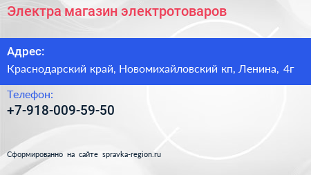 Электра, магазин электротоваров по адресу Краснодарский край, Новомихайловский кп, Ленина, 4г в дальнейшем Организация, размещена в следующих категориях: