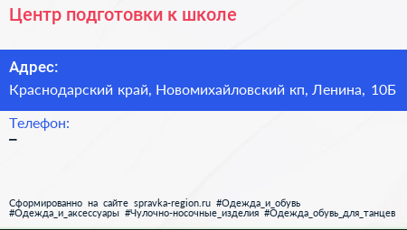 Центр подготовки к школе по адресу Краснодарский край, Новомихайловский кп, Ленина, 10Б в дальнейшем Организация, размещена в следующих категориях: