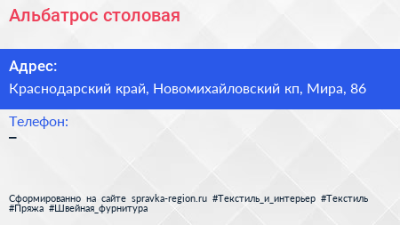 Альбатрос, столовая по адресу Краснодарский край, Новомихайловский кп, Мира, 86 в дальнейшем Организация, размещена в следующих категориях: