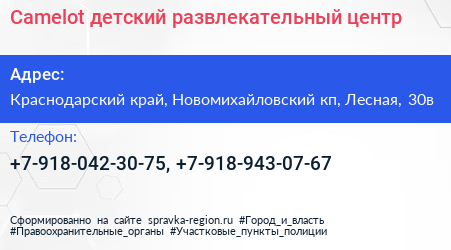 Camelot, детский развлекательный центр по адресу Краснодарский край, Новомихайловский кп, Лесная, 30в в дальнейшем Организация, размещена в следующих категориях: