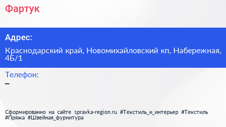 Фартук по адресу Краснодарский край, Новомихайловский кп, Набережная, 4Б/1 в дальнейшем Организация, размещена в следующих категориях:
