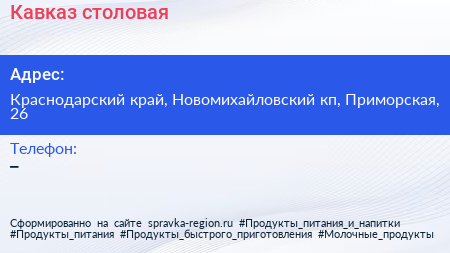 Кавказ, столовая по адресу Краснодарский край, Новомихайловский кп, Приморская, 26 в дальнейшем Организация, размещена в следующих категориях: