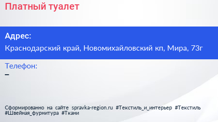 Платный туалет по адресу Краснодарский край, Новомихайловский кп, Мира, 73г в дальнейшем Организация, размещена в следующих категориях: